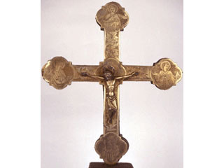 Sui lobi dei bracci sono gli Evangelisti. Sul verso, sono raffigurati la Vergine Maria, la Maddalena, San Lorenzo martire e Sant’Eugenia, i cui nomi sono cesellati entro le svecchiature che ornano i lobi della croce.